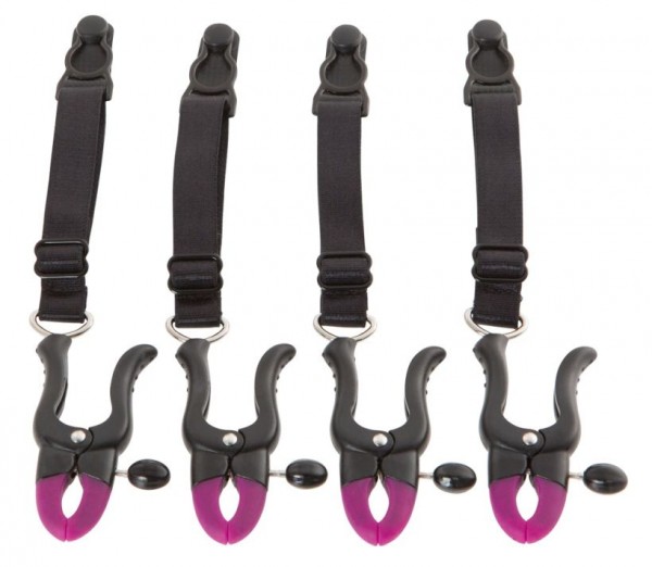 4 регулируемых пажа при помощи которых, Вы сойдете с ума от новых ощущений! Пажи крепятся к резинке чулка, а с обратной стороны выглядят в виде мини прищепок - "крабиков", при помощи которых зажимают половые губы! Помимо того, что это максимальное возбуждение для женщины, общий вид такого рода "расширителя" приведет в восторг каждого мужчину!