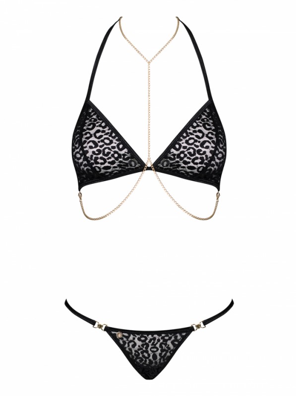 В комплект входит: трусики-стринги и лиф. Выполнены в черном цвете из нежного эластичного материала с принтом леопард!