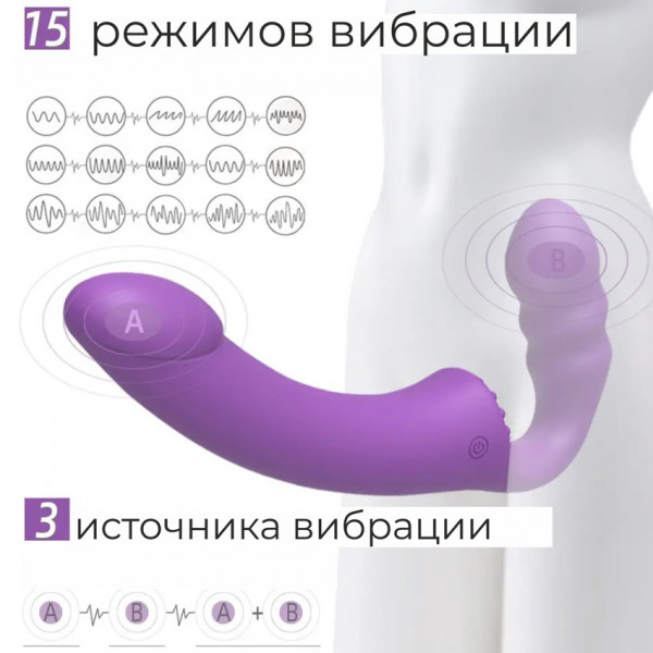 Страпон имеет 15 различных, невероятно мощных режимов вибрации и 2 мотора, что позволяет испытать обоим партнерам все уровни наслаждений! Управлять вибрацией легко и просто при помощи специальной кнопки, либо с дистанционного пульта управления
